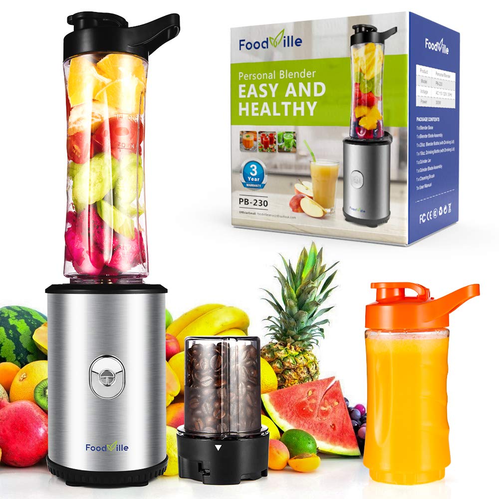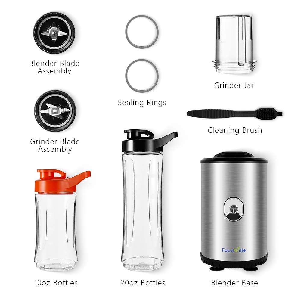 Foodville PB230 2 in 1 Personal Smoothie Blender and Electric Coffee Grinder with 20oz + 10oz Travel Bottles, 2 Drinking…