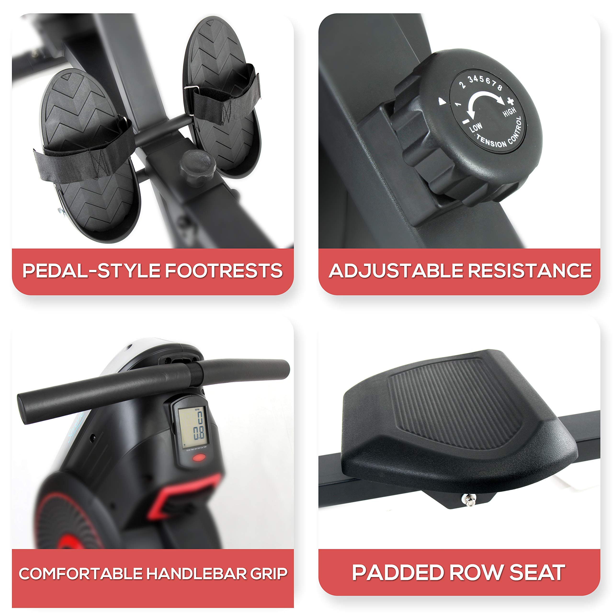 ADJUSTABLE RESISTANCE – with just a simple twist of a button, you’ll be able to increase or decrease the 8 levels of resistance on this home rowing machine, so your workout is in reality tailored to your needs and effective for your fitness journey