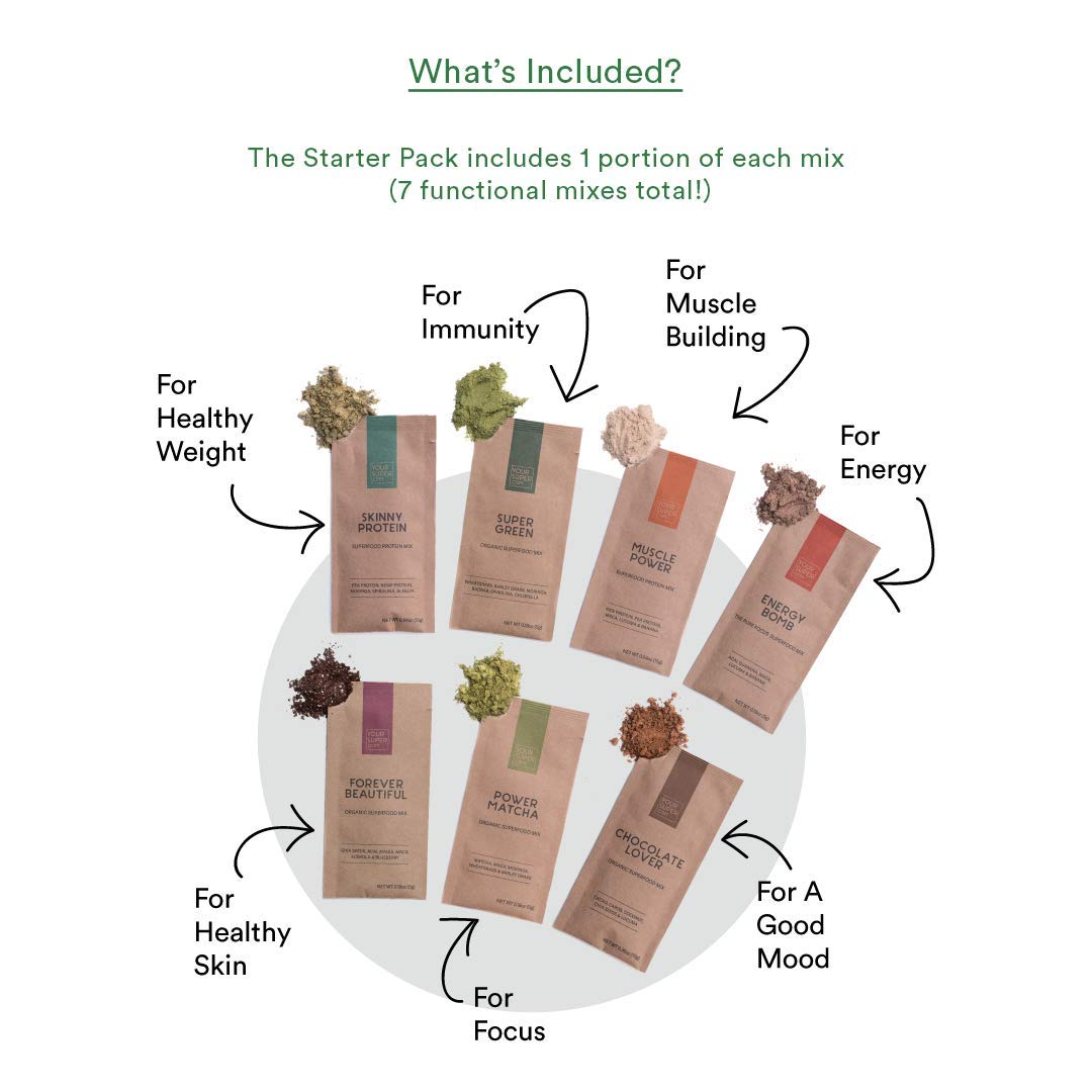 SUPERFOOD STARTER PACK: Your Super Starter Pack showcases 7 of our most popular organic superfood mixes – Skinny Protein, Super Green, Muscle Power, Energy Bomb, Forever Beautiful, Power Matcha, and Chocolate Lover.