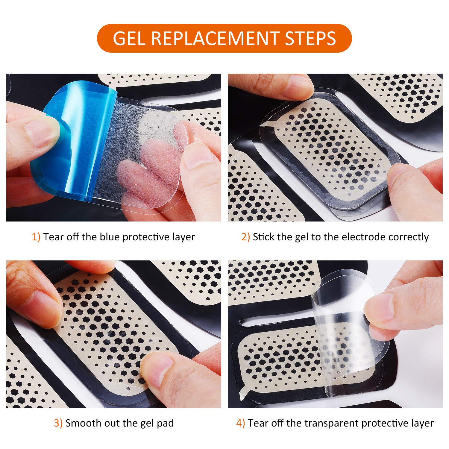 Please Deal with these gel pads for abs stimulator:Before the usage of, please clean up your skin;after the usage of, please stick them back to the cardboard.